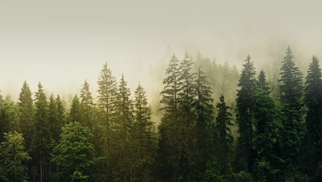 Biezs un zaļš skujkoku mežs, caur kura zariem spīd saules stari.